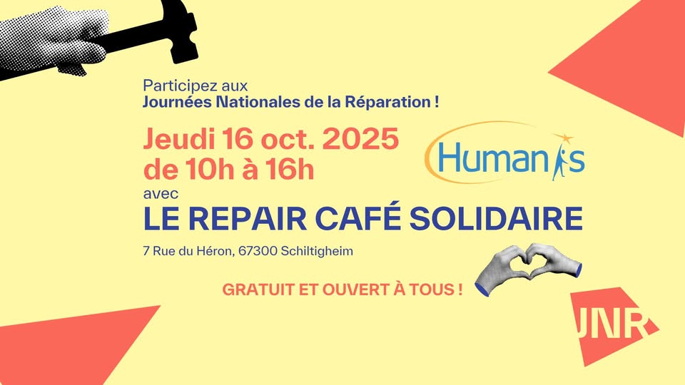 Le Collectif HUMANIS organise un Repair Café Solidaire le jeudi 16 octobre 2025 de 10h à 16h à HUMANIS (7 rue du Héron à Schiltigheim), dans le cadre des Journées Nationales de Réparation.