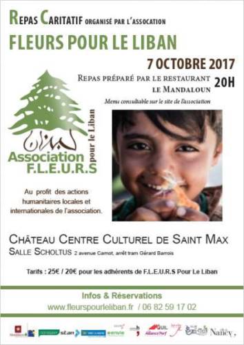 Nous vous accueillerons dans le magnifique Château Centre Culturel de Saint Max à partir de 20 h, tram arrêt Barrois. Le menu très copieux est affiché sur notre site: http://www.fleurspourleliban.fr . On peut me contacter au 06 82 59 17 02 pour obtenir des renseignements supplémentaires et pour réserver.