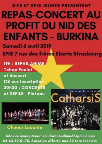 L’orphelinat le Nid 0 Bobo Dioulasso au Burkina Faso crée en 1999 accueille des enfants trouvés, des enfants abandonnés et des enfants dont la maman souffre de troubles mentaux. Les enfants sont référés par les services sociaux ou la justice. Une équipe nourrices et d’agents de santé s’occupe d’eux. Actuellement, il y a 107 enfants dont 22 sous le régime internat et 85 sous le régime externat. Ceux de l’externat vivent dans des familles d’accueil. Depuis sa création, l’orphelinat le Nid a accueilli plus de 1000 enfants. Les besoins du Nid sont l’acquisition d’un réfrigérateur médical permettant de stocker différents médicaments et vaccins, le renouvellement de la literie et la construction d’un poulailler pour gagner en autonomie financière. Notre 3ème édition sera encore différente mais toujours aussi riche et chaleureuse avec un succulent repas africain animé à 19h au prix de 12€, suivi d’un concert à 20h30 de deux chorales, l’une Strasbourgeoise Catharsis, l’autre belge Lucante, aux styles variés, pop, rock, gospel et variété française, entrecoupé d’un défilé africain, associant enfants et adultes. Divers stands seront présents dans le Hall. Nous vous attendons nombreux, motivés et nous réjouissons de réunir nos amis et connaissances à cette occasion.