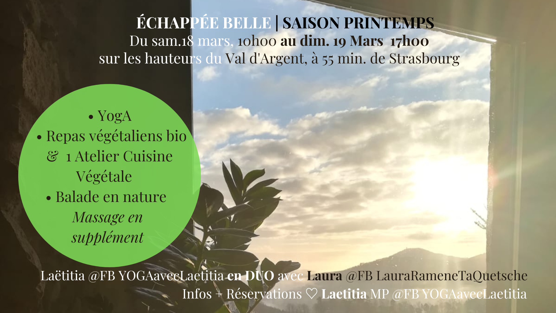 En duo avec LAURA FB@LauraRameneTaQuetsche, rejoignez-nous pour une Échappée Belle au diapason des énergies du PRINTEMPS ♡ Une parenthèse de 2 journées pour soi, hors du quotidien, pour un nouvel élan et une nouvelle saveur du quotidien, dans un écrin de verdure à 55 min. de Strasbourg, en connexion avec le vivant.