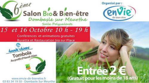 En partenariat avec l’association Handi chiens, Envie de bien-être organise la 6ème édition du salon Bio et Bien Etre les 15 et 16 octobre 2016. Pour répondre à une demande grandissante et accueillir plus de visiteurs, le salon n’aura plus lieu à Fléville-devant-Nancy mais à Dombasle-sur-Meurthe !