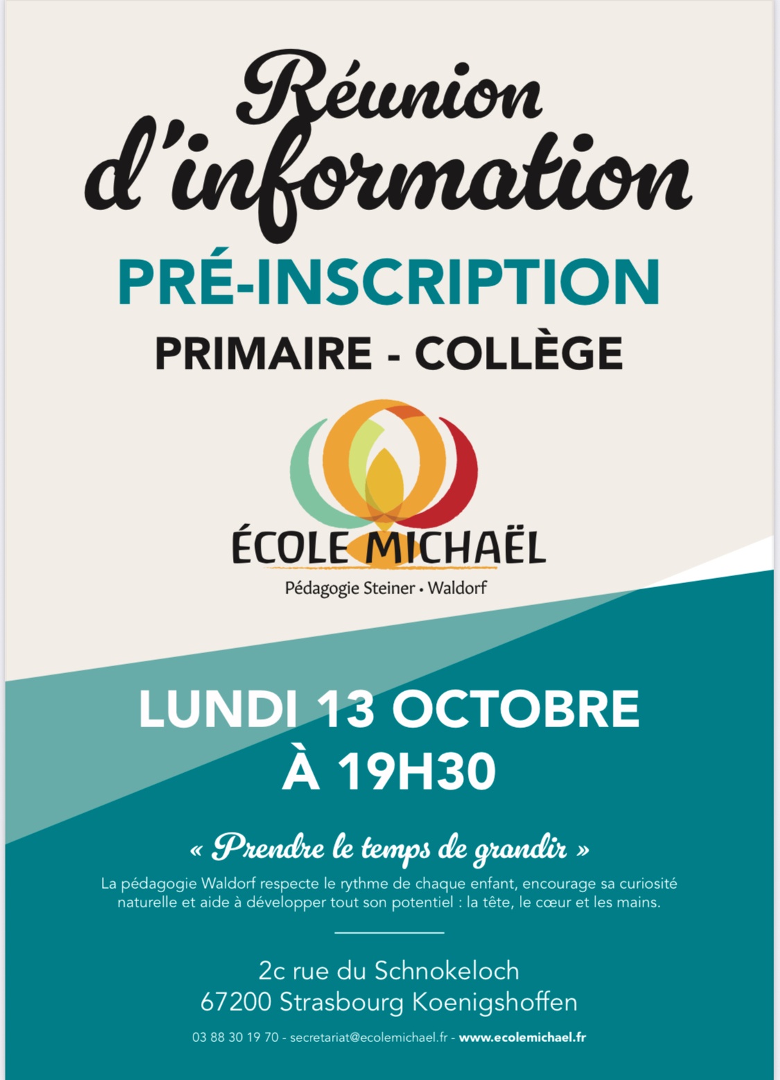 Nous vous invitons chaleureusement à participer à notre soirée d'information le lundi 13 octobre, à 19h30 afin de participer à un échange constructif autour de la pédagogie Steiner Waldorf pour les élèves de primaire et de collège.