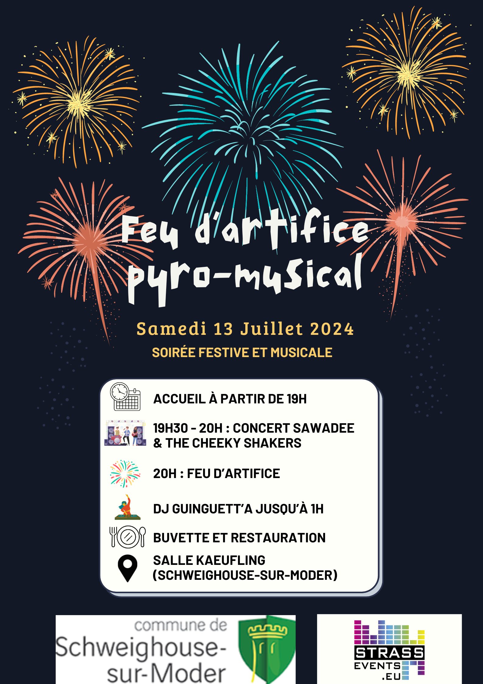 Bonjour à tous ! Une soirée feu d’artifice pyro-musical aura lieu ce samedi 13 juillet à la salle kaeufling à Schweighouse-sur-Moder. ?