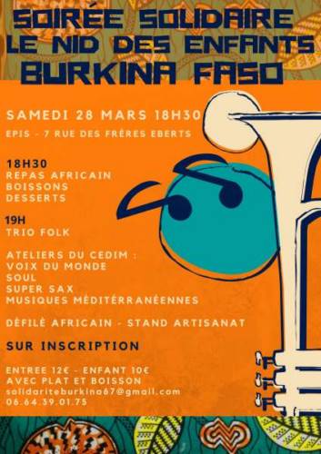 Voilà la quatrième année que nous organisons une soirée de soutien pour un orphelinat du Burkina Faso à l’EPIS 7 rue des frères Eberts a Strasbourg. Les éditons précédentes ont ramenées 200 personnes à chaque fois. Notre programme musical sera varié cette année puisque nous aurons la chance d’avoir les ateliers du CEDIM qui participeront à cette édition. Nous aurons également une variété de plats et boissons africaines. Toutes les infos sont sur l’affiche. Venez nombreux !