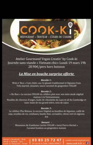 L’Association Veg Nature Lorraine a le plaisir de vous annoncer que la prochaine Soirée "Vegan Creativ’ by Cook-ki" aura lieu le lundi 19 mars à 20h00 au Restaurant Cook-Ki au 34 Rue de la Salle à Nancy.