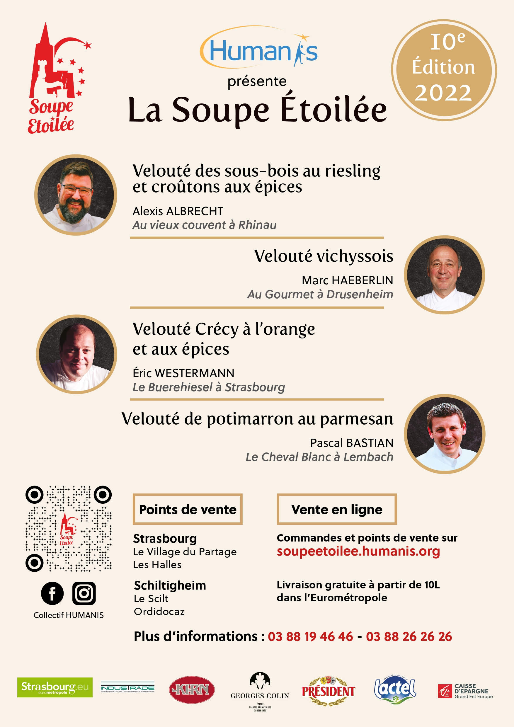 Le Collectif d’associations de solidarité HUMANIS vous invite à découvrir la 10e édition de la Soupe Étoilée sur la Place Kléber à Strasbourg et dans différents points de vente en Alsace.