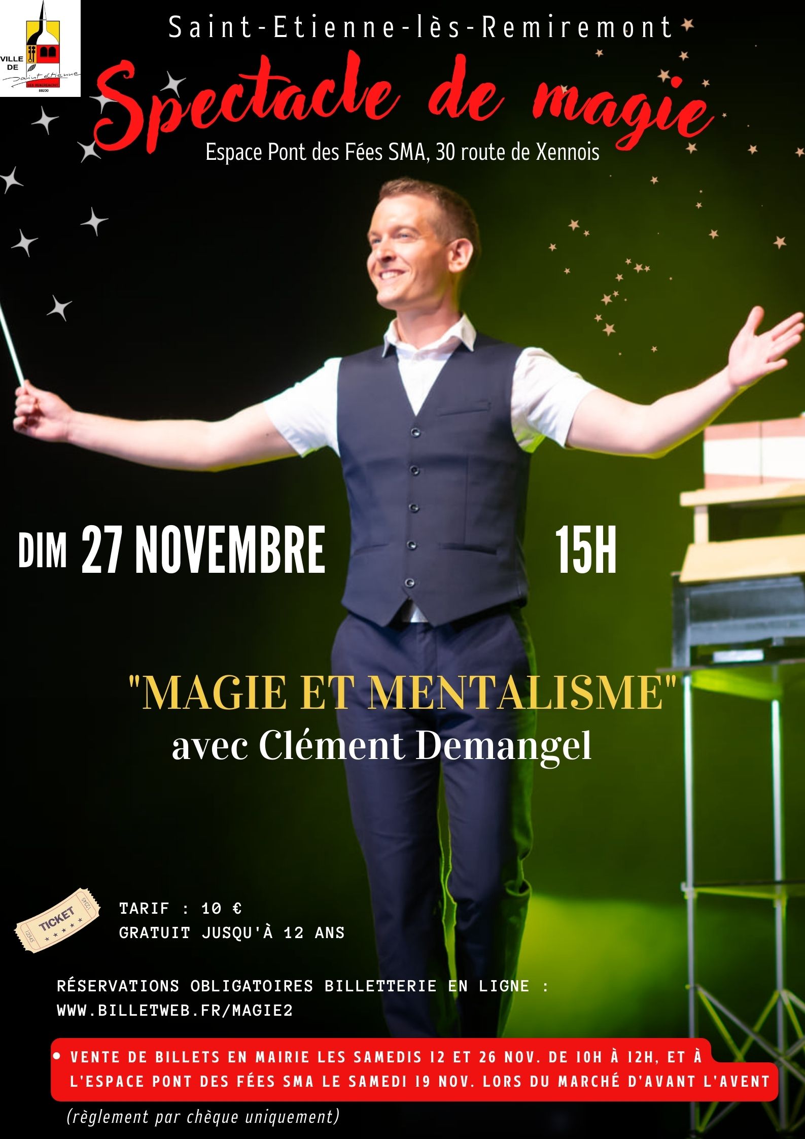 Vente de billets en mairie les samedis 12 et 26 novembre de 10h à 12h et à l'Espace Pont des Fées SMA le samedi 19 novembre lors du marché d'avant l'Avent (règlement par chèque uniquement)