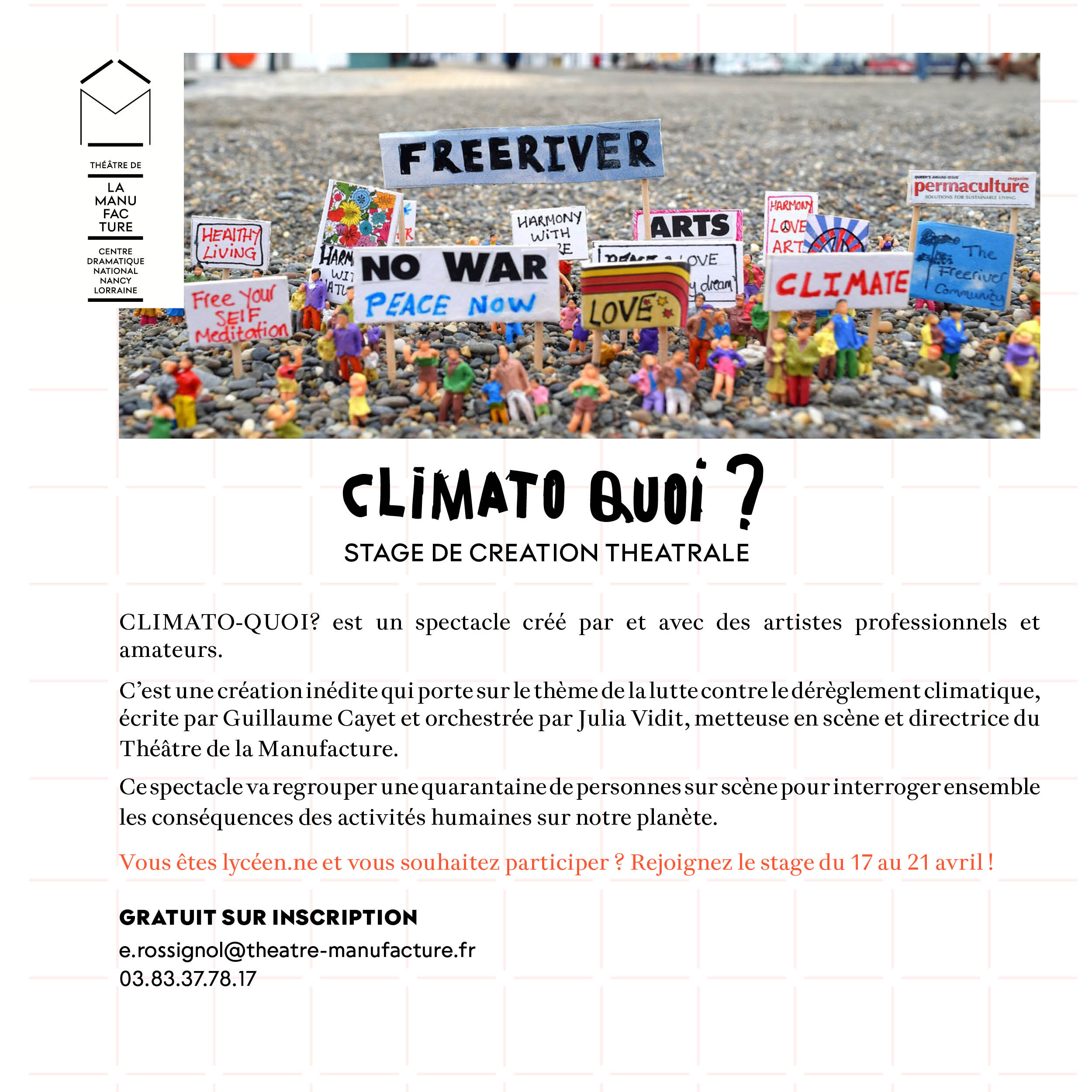 Renseignements et inscription auprès d'Emilie Rossignol: 03 83 37 78 17 / e.rossignol@theatre-manufacture.fr