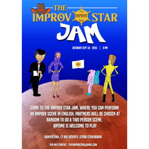 Lors de cette jam d'improvisation théâtrale anglophone, des improvisateurs d'horizons divers joueront par paires choisis au hasard. Ils créeront des scènes et des personnages spontanémant, dans l'instant, en embrassant et en affrontant l'inconnu. Tous les niveaux sont les bienvenus, des débutants aux artistes chevronnés. Vous pouvez donc jouer vous aussi si l'envi vous prend !