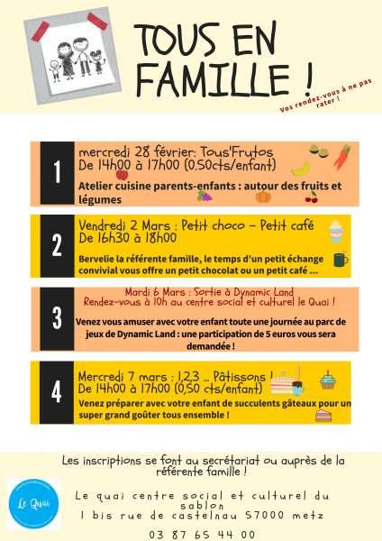 J’ai le plaisir de vous inviter à nos ateliers « Tous en famille » au centre social et culturel « Le Quai ».