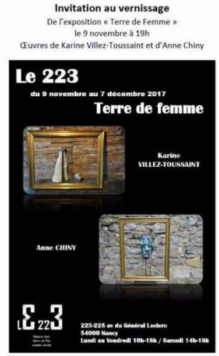 Du 9 novembre 2017 au 7 décembre 2017 Anne CHINY et Karine VILLEZ investissent l’espace du 223 pour une exposition joliment intitulée TERRE DE FEMME. Anne sculpte depuis 20 ans, entre figuratif et abstrait, l’artiste utilise la terre, le cristal et le cuivre pour donner forme à ses femmes. A l’encre et à la plume, Karine quant à elle, fait naitre papillons, coquelicots et bien d’autres poésies florales. Pour l’occasion, elle nous dévoilera ses premières réalisations en terre.