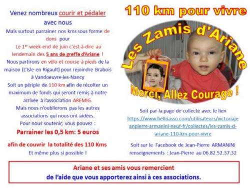 Pour fêter les 5 ans de rémission d’Ariane, ses parents organisent un défi incroyable au profit de l’AREMIG : ″Les Zamis d’Ariane, 110 km pour vivre″. En course à pied et/ou à vélo, ils vont relier leur maison de L’Isle en Rigault à l’ancienne chambre d’Ariane à Brabois.