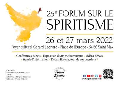 Evénement national, ce 25è Forum s’adresse à toutes les personnes qui souhaitent s’informer sur le Spiritisme, philosophie et science de l’être issues du travail d’Allan Kardec et des séances spirites depuis 1974 au sein du Cercle Spirite Allan Kardec. Les spirites, en toutes ses représentations régionales, se tiennent à votre disposition pendant ces deux journées, où rencontres et échanges restent uniques en France.