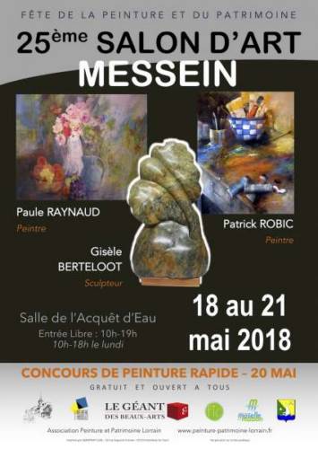L’association Peinture et Patrimoine Lorrain a le plaisir de vous accueillir du 18 au 21 mai 2018 à son 25ème Salon d’Art qui aura lieu à Messein de 10h à 19h (sauf lundi à 18h) - salle de l’Acquêt d’eau.