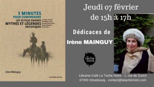 A l’occasion de sa venue à Strasbourg, Irene Mainguy fera une séance de dédicaces exceptionnelle à la Librairie-Café La Tache Noire autour de son dernier ouvrage : 3 minutes pour comprendre les 50 plus grands mythes et légendes initiatiques