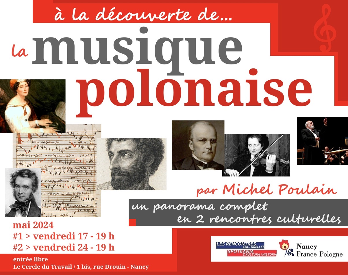 Rencontre culturelle de l’association Nancy France-Pologne. Intervention de Michel Poulain, qui présente, en deux séances, un panorama de la musique classique polonaise et de son évolution, au fil de l’histoire du pays et des grandes tendances de la création musicale en Europe. Entrée libre.
