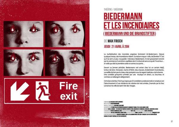 La multiplication des incendies angoisse fortement M.Biedermann. Depuis quelques temps, des incendiaires rôdent. Sa maison risque t-elle, de flamber - C’est qu’il se sent un peu ’coupable’ Monsieur Biedermann. Il s’est grassement enrichi par le commerce d’une lotion capillaire dont il a licencié sans scrupule l’inventeur... et voilà que dès la première scène on sonne à sa porte... Devant sa femme pétrifiée, Biedermann voit entrer chez lui un certain Niaff, lutteur de foire ; Ferrassier, maitre d’hôtel ; deux lascars, évidemment incendiaires, surveillés de loin par le choeur des pompiers sous le regard malicieux de la bonne. Une comédie grinçante rythmée par une musique en direct, ou bourreau et victimes se mélangent allégrement. Cette farce de Max Frisch qui regroupe 25 comédiens professionnels et amateurs est l’aboutissement d’une résidence de création de trois années, financée par la Drac Lorraine et la ville de Saint-Dié-des-Vosges.