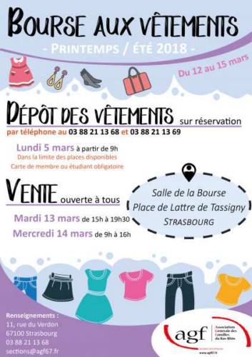 Le dépôt des vêtements destinés à la vente se fera les lundi 12 et mardi 13 mars uniquement sur rendez-vous et dans la limite des places disponibles. Merci de nous contacter au 03 88 21 13 69 ou 03 88 21 13 68 le lundi 5 mars à partir de 9 h.(carte de membre AGF ou carte étudiant obligatoire)