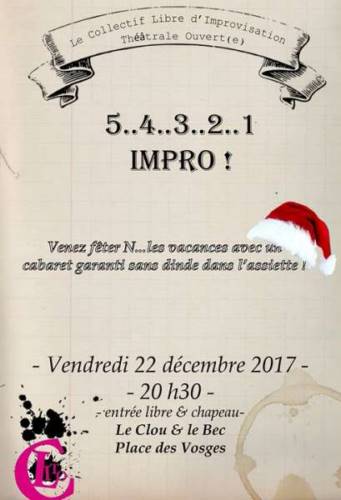 Le C.L.I.T.O vous donne rendez-vous pour le dernier cabaret impro de l’année 2017 ! Histoire de finir l’année en beauté, on ne parlera pas d’actualité morbide ou financière, ni de terrorisme, mais peut-être d’extra terrestre ou de poudre magique pour faire pousser des arlequins...qui sait -