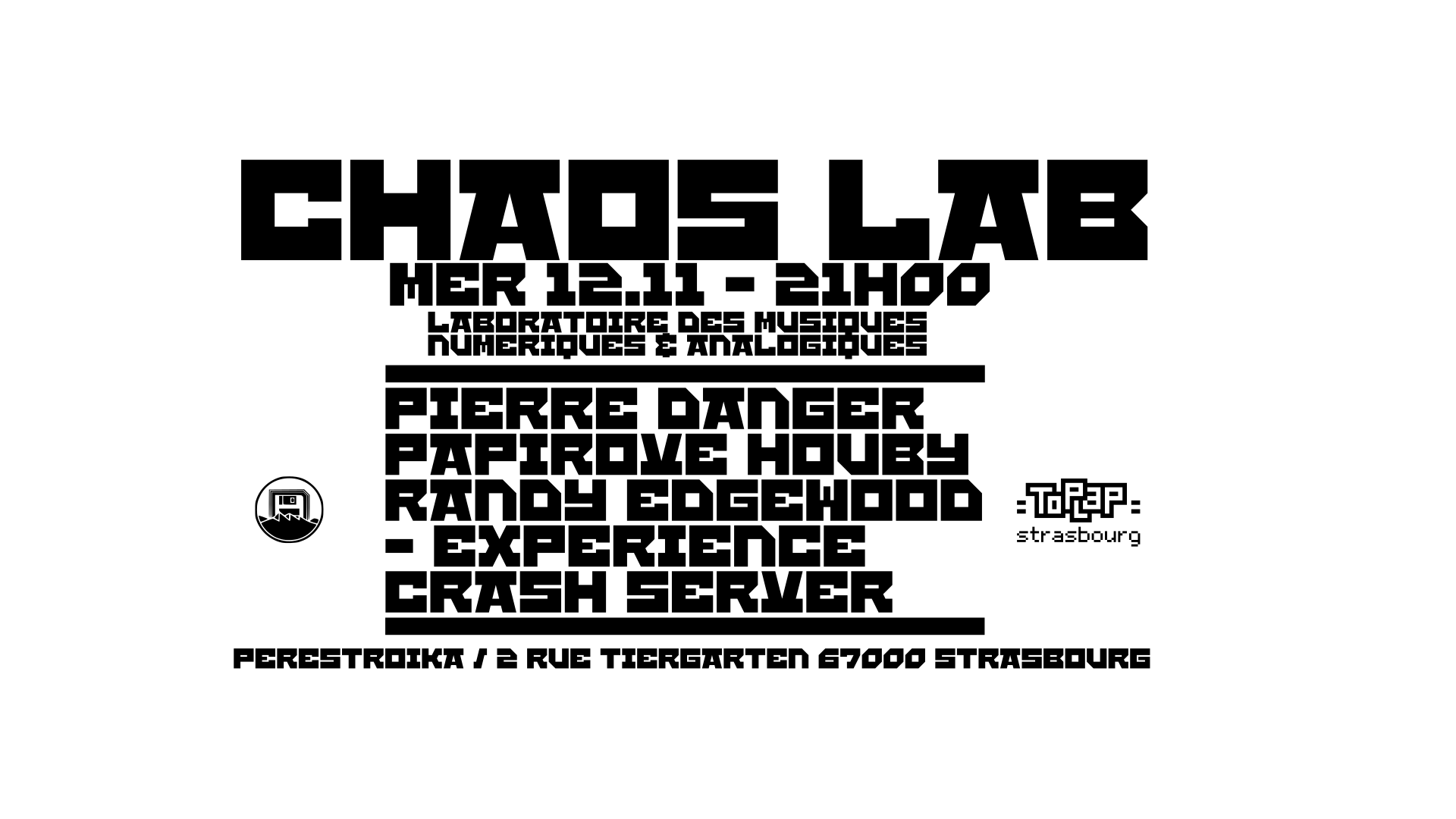 Plongez dans l’univers atypique de Chaos Lab, une série d’événements conçus pour explorer la frontière entre le bruit, le code, l’immersion audio-visuelle et la rupture. À chaque édition, nous privilégions les expériences live exclusives, l’art du livecoding, la collision entre sons organiques et machines numériques, et une voix libre pour chaque création. Préparez-vous à être emporté·e dans un voyage inattendu où chaos rime avec création. Projection video à tous les concerts, performances live sans compris.