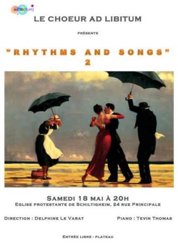 Le programme 2019 d’Ad Libitum est intitulé "RHYTHMS AND SONGS 2" , il pulse comme jamais, avec un joli bouquet de tangos (Gardel, Piazzola), de standards de jazz (All of me, Blue Skies…), de spirituals (Elijah Rock, Keep your lamps) et en prime le fameux "Chili con carne", morceau de bravoure du quintet vocal suédois The Real Group.