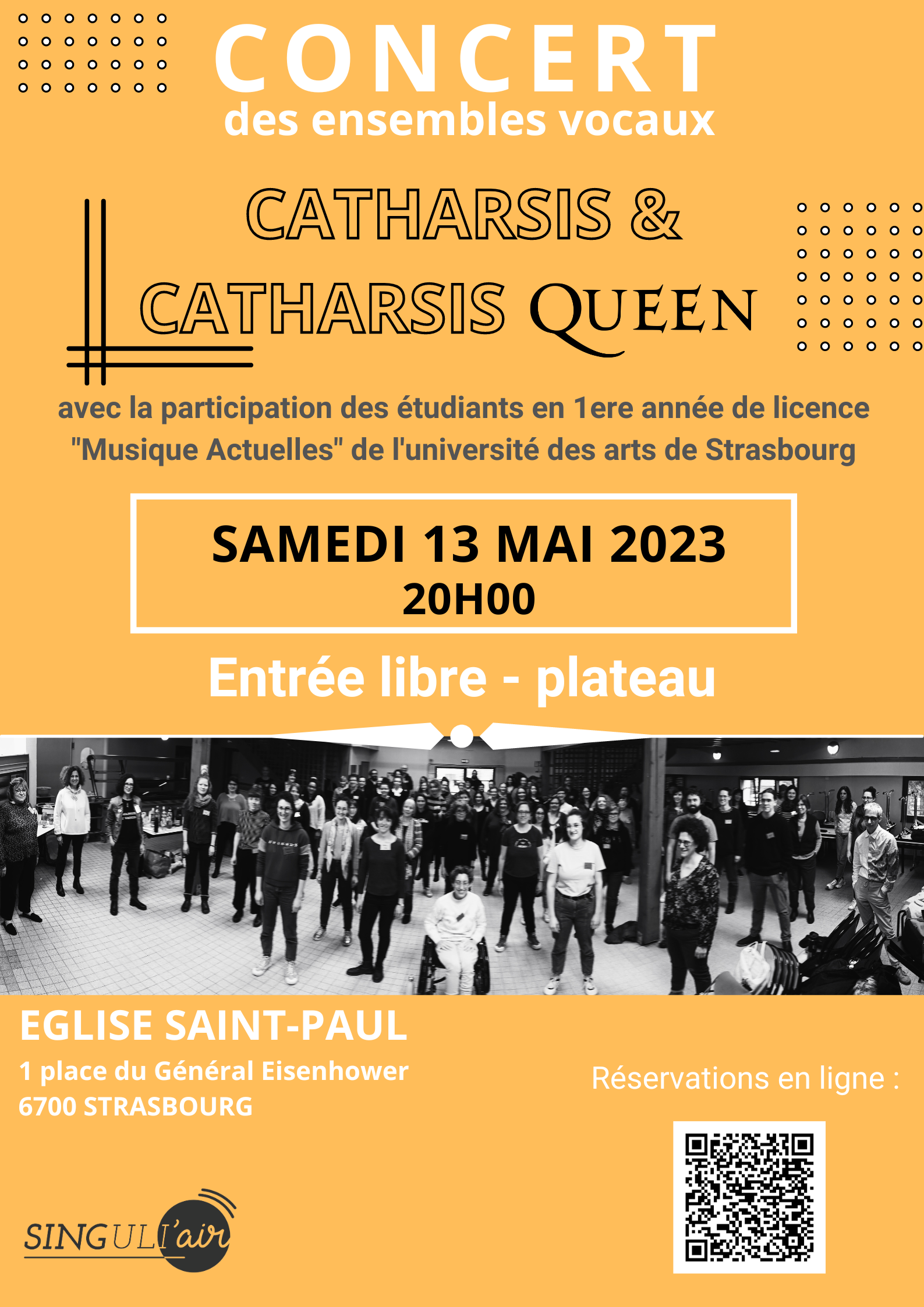 Les Ensembles Vocaux CATHARSIS et CATHARSIS QUEEN vous invitent à un concert le samedi 13 mai 2023 à l'Eglise Saint-Paul.