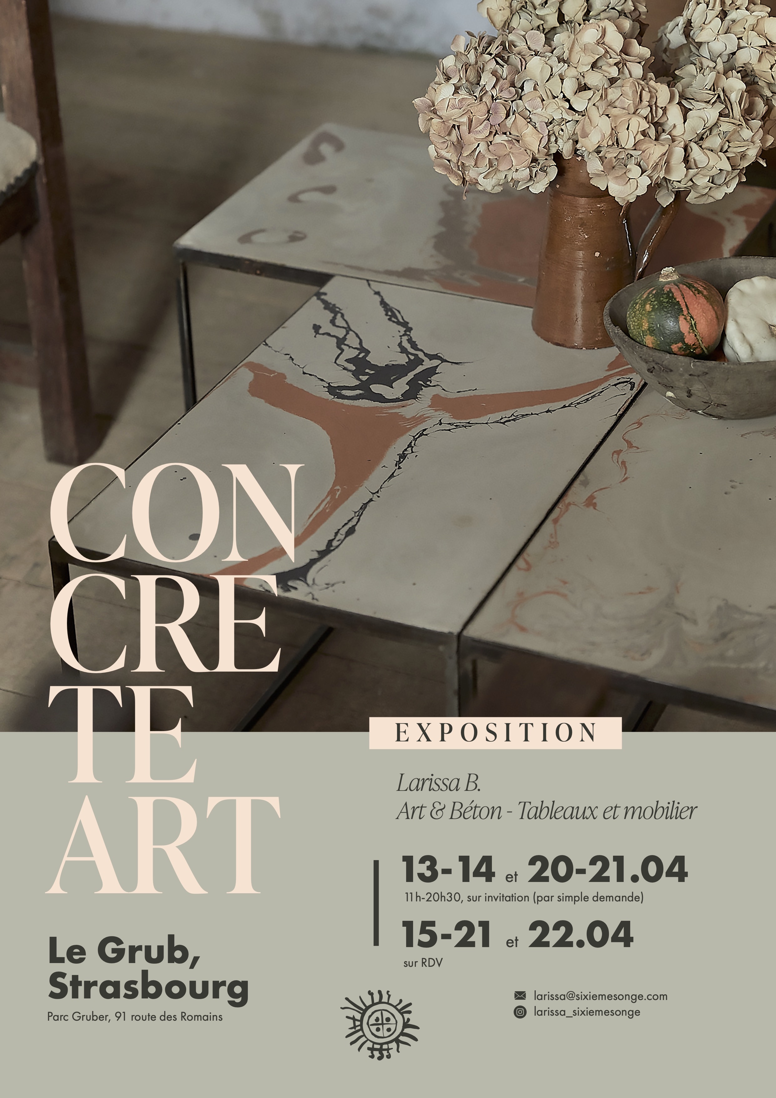 Larissa B. quitte Strasbourg en 2013 après plusieurs années consacrées à des projets culturels divers, créant des décors, organisant des évènements festifs ou encore des ateliers d’expression artistique à destination de jeunes publics, toujours dans le souci de s’accorder avec ses engagements environnementaux, humains et son désir de solliciter la puissance créative de chacun. Elle emporte avec elle sa signature, Sixième Songe, exprimant sa nécessité de se nourrir de la part imaginaire du monde, et après des arrêts en Aveyron et en Ardèche avec son conjoint Philippe Bronner pour des projets de restauration de bâti ancien, c’est en 2015 qu’elle s’installe dans le pays de Morlaix, en Bretagne. Elle y poursuit ses activités artistiques, mais cette fois-ci en son seul nom et commence à créer avec Philippe des objets en collaboration avec des artisans locaux. D’abord attachée à l’expérimentation de techniques anciennes, elle découvre le travail du béton en 2016 et la technique du ragréage sur conseil d’un artisan local, lorsque la nécessité de restaurer le sol de son nouveau showroom s’impose. Elle conjugue aussitôt cette technique avec son univers, lui adjoignant des pigments naturels, un respect de l’aléa et sa propre conversation avec l’espace d’implantation. Depuis cette première expérience, elle ne cesse d’affiner sa connaissance de ce matériau, avec lequel elle n’avait pourtant que peu d’affinités éthiques, et réalise des sols singuliers au sein d’intérieurs publics (Contes à Rebours, à Morlaix, musée dédié à l’univers des contes) ou privés. C’est dans la continuité de cette pratique et de son goût pour l’usage de l’existant que Larissa B. utilise les reliquats laissés par ses sols pour créer des tableaux, tables, sculptures, sa coopération avec des menuisiers et ferronniers lui fournit les structures et cadres, soit sur mesure, soit conçus à partir de matériaux de récupération.