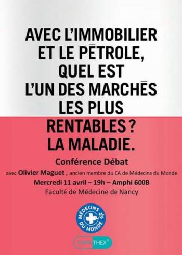 Empathex et Médecins du Monde vous invitent à débattre sur ce sujet avec Olivier Maguet, ancien membre du Conseil d’Administration de Médecins du Monde et responsable du projet Prix du Médicament et systèmes de santé le mercredi 11 avril à 19h - Amphi 600B.
