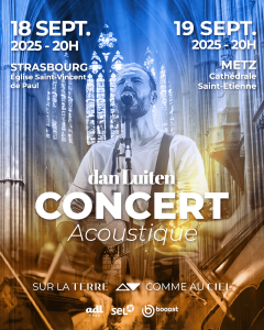 Dans les cadres uniques de l’église Saint-Vincent-de-Paul et de la majestueuse cathédrale Saint-Étienne, l’artiste reprendra les titres de ces deux albums Sur la terre et Comme au ciel, accompagné d'un quatuor à cordes d’exception. Un moment suspendu à vivre en famille, entre amis ou en solo. La tournée de rentrée de Dan Luiten : un événement à relayer massivement !