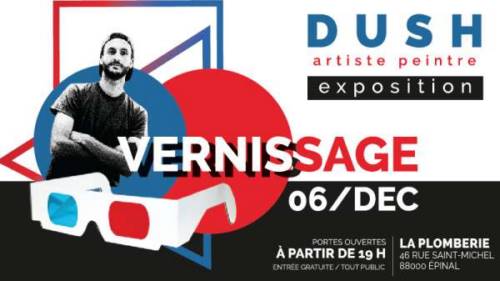 Dush investit le lieu-dit « La plomberie » de par ses peintures et tableaux avec un soupçon de folie; sans trop en dire, une interaction visuelle avec chacune de ses œuvres présentées est possible grâce à un jeu de couleurs obtenu par les lunettes 3D.