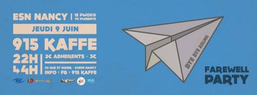 Chers étudiants, vous voulez faire la fête une dernière fois avec vos amis Erasmus - Toute l’équipe ESN Nancy vous invite alors à les rejoindre le 9 juin au 915 Kaffe à partir de 22h pour profiter une dernière fois de votre aventure Erasmus ! Préparez-vous à passer une soirée mémorable !