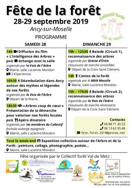 Les 28 et 29 septembre, le Collectif Forêt qui réunit neuf associations locales, vous invite à la deuxième Fête de la Forêt. Elle s’ouvrira samedi par la projection du film « L’Intelligence des Arbres » à la Mairie d’Ancy et se poursuivra par une déambulation dans le village autour des mythes et légendes de nos forêts. Le Collectif présentera ensuite sa démarche « arbres coups de c?ur », un projet qui vise à mettre en valeur les forêts de la région. Le dimanche deux balades guidées, une le matin et une l’après-midi, toutes les deux au départ de la Croix Saint Clément, vous emmèneront à la reconnaissance des arbres et à découvrir, qui sait, vos propres arbres coup de c?ur. Entre les deux randonnées, vous pourrez écouter des contes de la forêt à la Mairie d’Ancy.