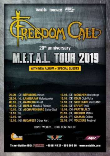 Venez fêter les 20 ans de Freedom call au grillen de colmar ainsi que la sortie de leur nouvel album "METAL". Un nouveau line up, donc une nouvelle dynamique au sein du groupe!! Du heavy metal comme on aime!