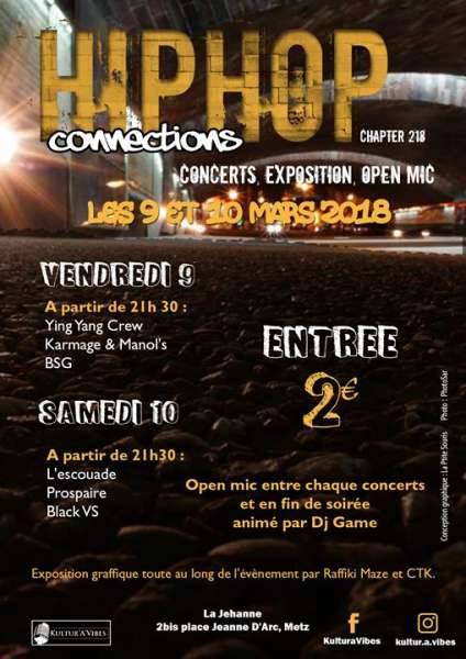 Hip hop connections is back!!! Le rendez-vous des amoureux du Hip Hop et principalement du Rap. Le temps d’un week-end, 6 groupes locaux se partagerons la scène. Ils vous feront découvrir leurs univers, tout en vous faisant passer un bon moment au rythme de leur musique.