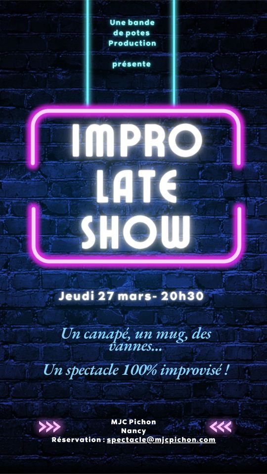 L'IMPRO LATE SHOW est un spectacle unique, car complètement improvisé. Le public met les joueurs au défi : ils doivent inventer en "direct live" des histoires, sketchs, discours, chansons, etc... sur des thèmes imposés et avec des contraintes de jeu assez folles. Pas le choix, pour relever le challenge, les joueurs n'ont d'autre solution que de donner le maximum.