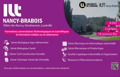 Professeurs, étudiants et professionnels des huit spécialités de l’IUT seront mobilisés pour présenter leurs formations et répondre aux questions des visiteurs. De la biologie, aux travaux publics, en passant par l’agronomie, la diététique, les télécommunications, l’électronique ou encore l’étude des procédés industriels, L’IUT Nancy-Brabois mettra à l’honneur sa grande offre de formation.