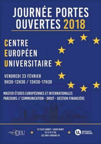 Le Centre Européen Universitaire et ses étudiants vous accueillent le 23 février 2018 de 9h30 à 12h30 et de 13h30 à 17h30.
