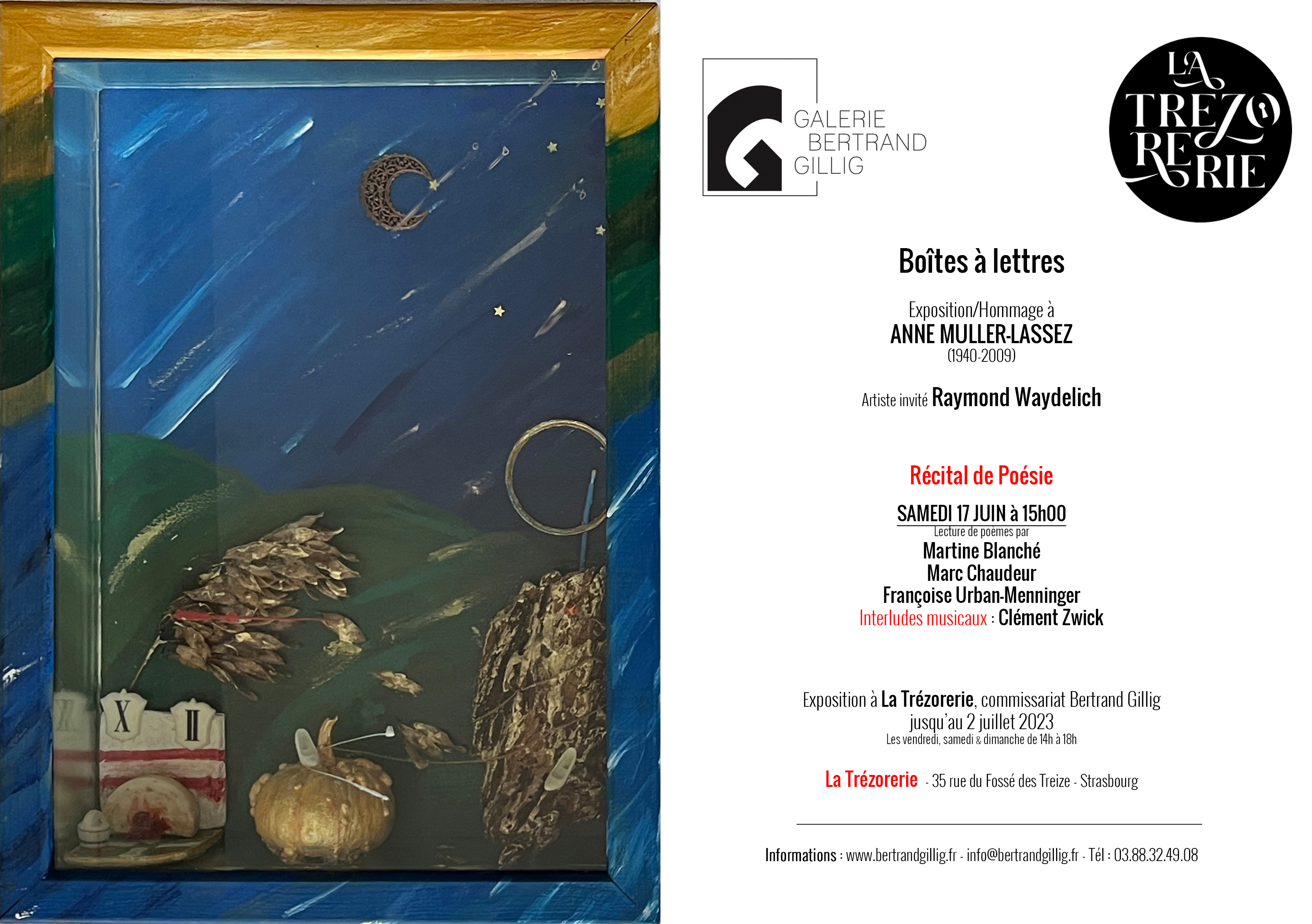 Dans le cadre de la rétrospective consacrée aux oeuvres d'Anne Muller-Lassez dans un nouveau lieu à Strasbourg, la Trézorerie située 35 rue du Fossé des Treize, la Galerie Bertrand Gillig a réuni sous le titre de "Boîtes à Lettres" des réalisations de l'artiste ainsi que cinq créations de Raymond Waydelich. dans ce cadre, une lecture de poèmes en lien avec les oeuvres sera proposée par Martine Blanché, Marc Chaudeur et Françoise Urban-Menninger qui liront leurs écrits éccompagnés en musique par Clément Zwick.