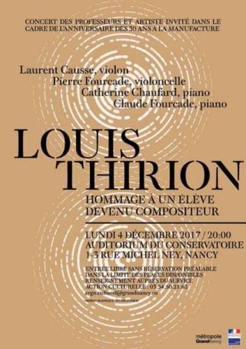 Laurent Causse (violon), Pierre Fourcade (violoncelle), Catherine Chaufard et Claude Fourcade (piano) rendent hommage au compositeur et ancien directeur du Conservatoire régional du Grand Nancy, Louis Thirion.