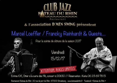 Pour clôturer cette saison 2017, le dernier concert avec bien sur Marcel Loeffler il sera entouré de musiciens de qualité suivi en 2ème partie par Francky Reinhardt qui sera accompagné de quelques musiciens de Di Mauro Swing et d’autres musiciens