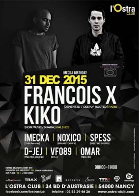 Toute l’équipe de L’Ostra Club vous invite à fêter cette fin d’année 2015 et présente deux pointures de la scène Techno française : KIKO et Francois X boss du label DEMENT3D et résident chez Concrète.