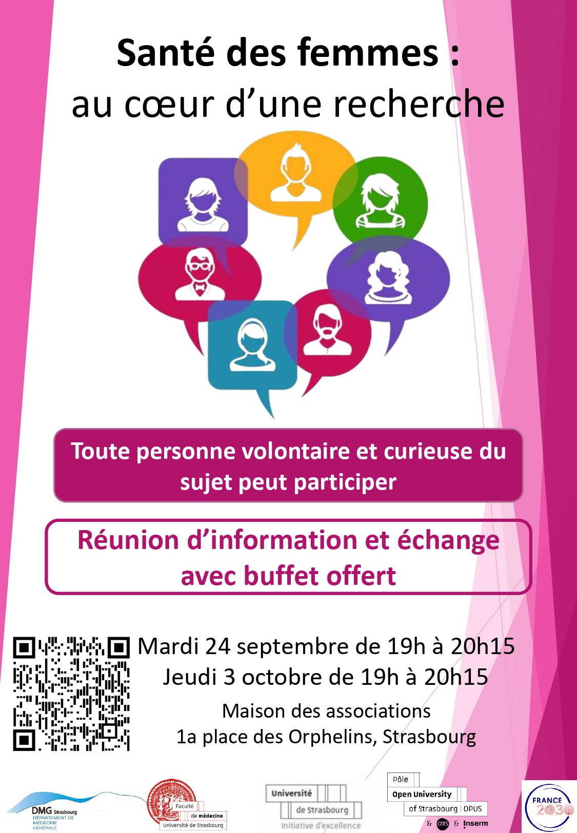 Les inscriptions sont recommandées en utilisant le lien suivant : https://dmg.unistra.fr/recherche/sante-des-femmes/recherche-participative