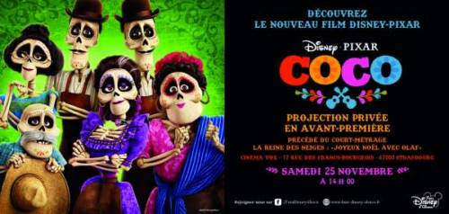 Nous vous donnons rendez-vous le samedi 25 novembre 2017 à 14h afin d’assister à la projection en avant-première de Coco (sortie nationale le 29 novembre 2017) et de son court-métrage de La Reine des Neiges : Joyeux Noël avec Olaf en version française 2D au Cinéma Vox de Strasbourg (17 rue des Francs Bourgeois, 67000 Strasbourg) !