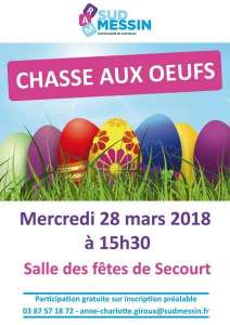 Comme il est de coutume chaque année à l’approche de Pâques, le Relais Assistants Maternels (RAM) du Sud Messin propose une chasse aux œufs le mercredi 28 mars à 15h30 à la salle des fêtes de Secourt.