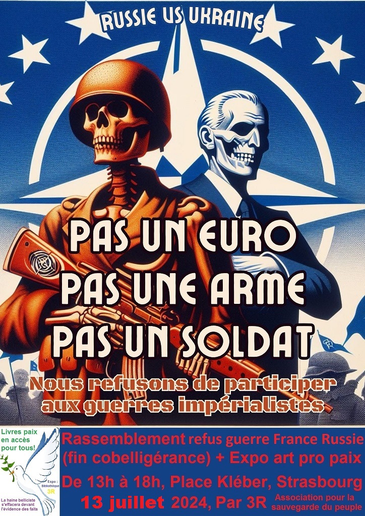 Le 13 juillet à Strasbourg, nous distribuerons nos nouveaux tracts qui feront vomir les mondialistes. Avis aux zélateurs des pseudos valeurs morales pour lesquelles nous devrions combattre l’ours mal léché ; prenez votre paquetage et lorsque vous serez En marche (sans retour) vers l’Éden "démocratique" Ukrainien, nous serons en paix.
