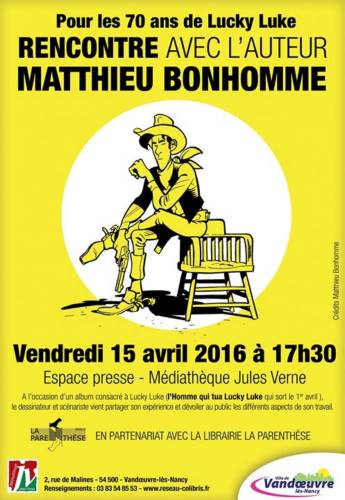 A l’occasion d’un album consacré à Lucky Luke (l’Homme qui tua Lucky Luke qui sort le 1er avril), en hommage à son 70ème anniversaire, le dessinateur Matthieu Bonhomme vient partager son expérience et dévoiler au public les différents aspects de son travail.