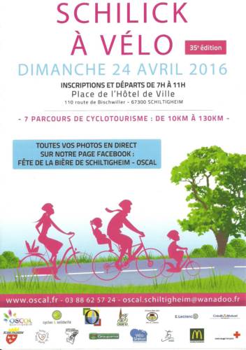 Schilick à Vélo revient pour sa 35ème édition ! Organisée conjointement par l’OSCAL et le Cyclo Club de la Roseraie de Schiltigheim, Schilick à Vélo est une manifestation de cyclotourisme proposant 7 parcours à vélo, fléchés, pour toute la famille. Vous retrouverez sur votre parcours des points de ravitaillement*. Parcours : 10KM - 20KM - 40KM - 50KM - 85KM - 100KM & 130KM.