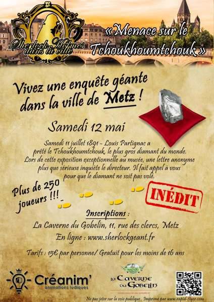 Créanim’, société d’animation spécialisée dans les jeux géants, vous propose un scénario inédit du jeu Sherlock Holmes Géant dans la ville : "Menace sur le Tchoukoumchouk, le plus gros Diamant du Monde" !