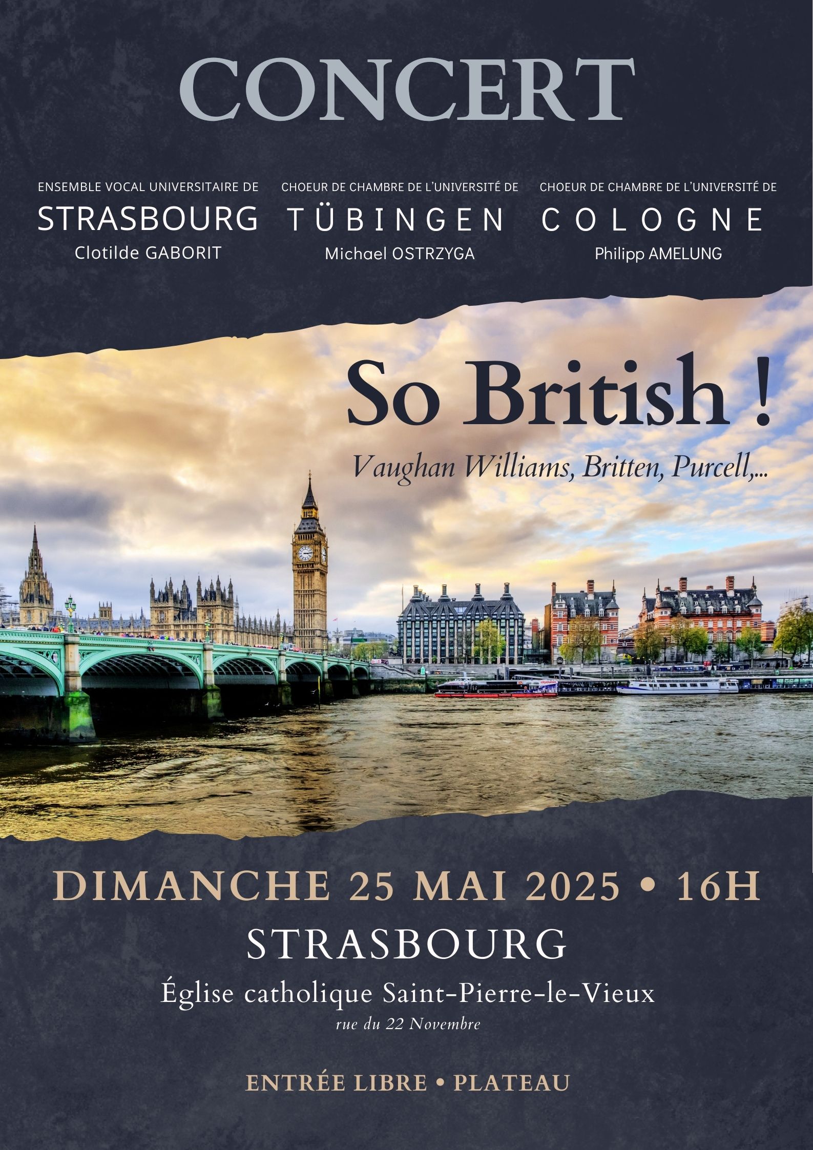 Aux côtés du Camerata Vocalis de Tübingen (Philipp Amelung) et du Kammerchor der Universität de Cologne (Michael Ostrzyga), l’EVUS vous invite à découvrir un programme riche et varié, réunissant les œuvres de grands compositeurs britanniques tels que Henry Purcell, Gerald Finzi, Gustav Holst, Ralph Vaughan Williams et Benjamin Britten. Ce concert intitulé "So British!" mettra à l’honneur la richesse des harmonies anglaises, entre lyrisme pastoral, ferveur sacrée et modernité audacieuse.