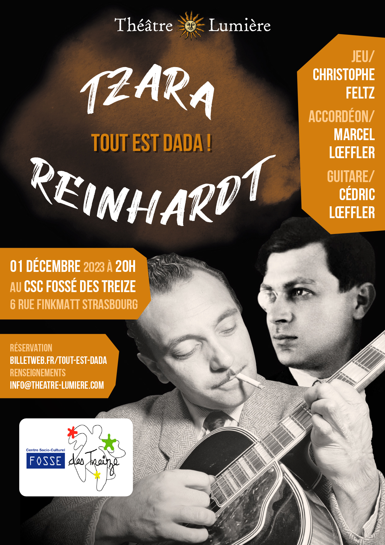 Pour cette nouvelle création de théâtre musical, la compagnie Théâtre Lumière s’est immergée dans l’œuvre de l’inventeur du mouvement intellectuel et artistique « Dada », Tristan Tzara (de son vrai nom Samuel Rosenstock), et du célèbre guitariste manouche Django Reinhardt.